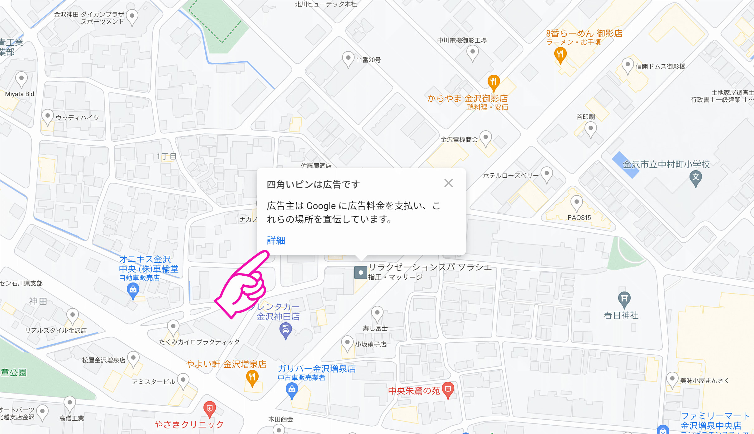 「四角いピンは広告です 広告主はGoogleに広告料金を支払い、これらの場所を宣伝しています。」