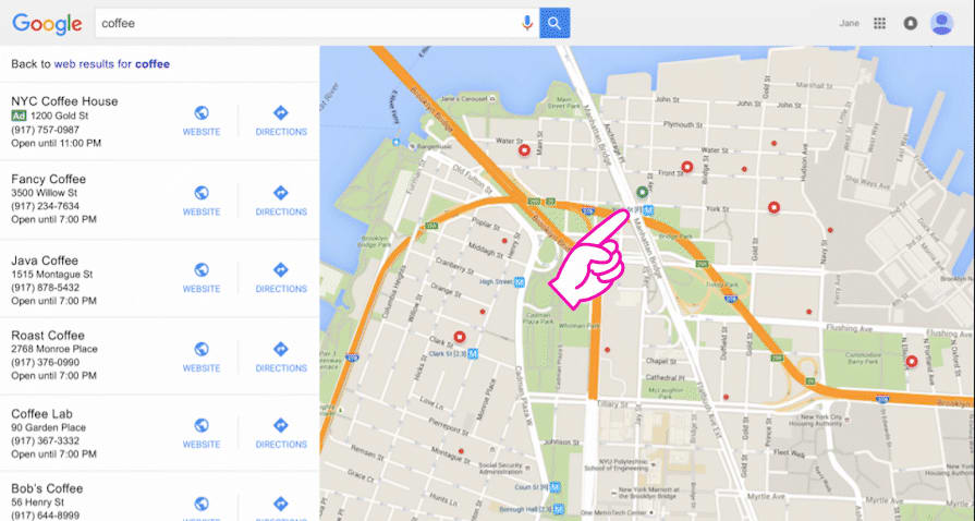 ユーザーが Google.com や Google マップで近隣の店舗(「近くにあるコーヒー ショップ」など)を検索した際に、お客様のビジネス拠点をローカル検索広告に表示することができます。