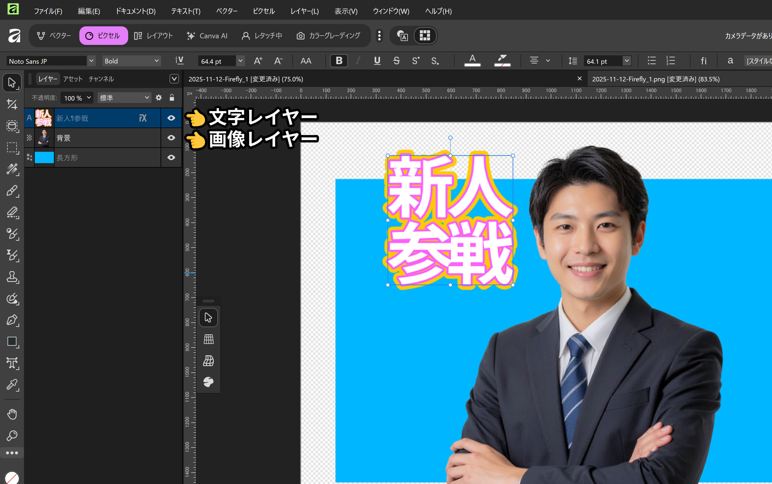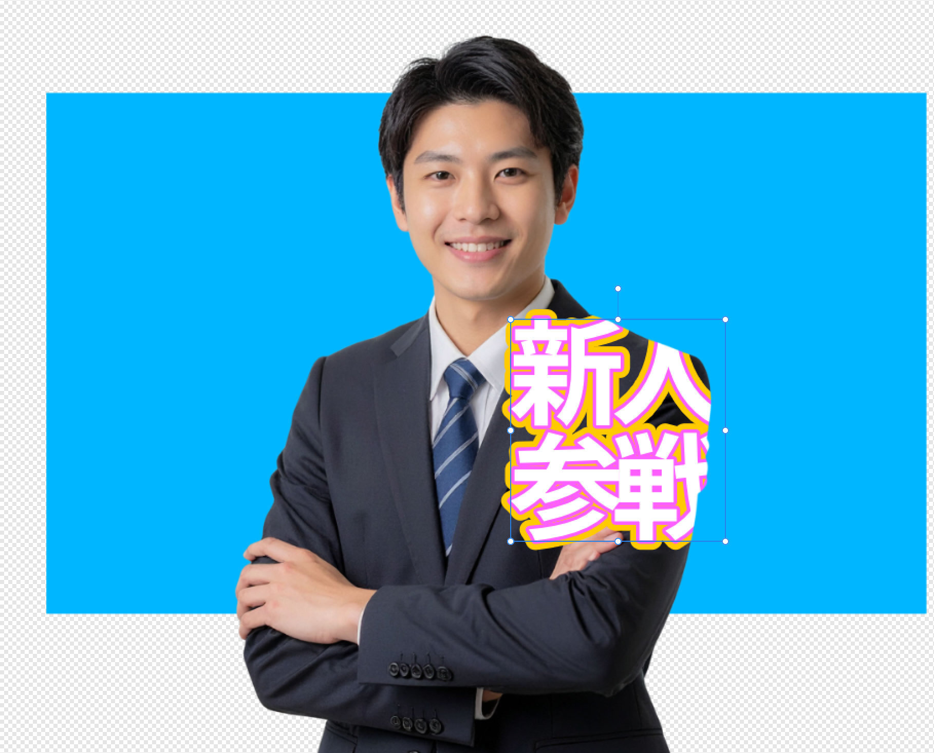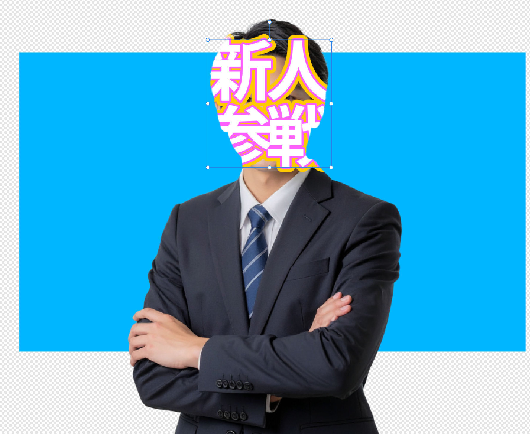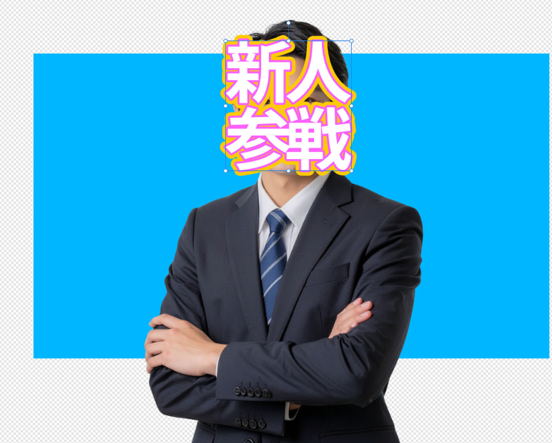 上に文字レイヤー、下に画像レイヤーです。人物の画像は背景を透明にしたPNGファイルです。