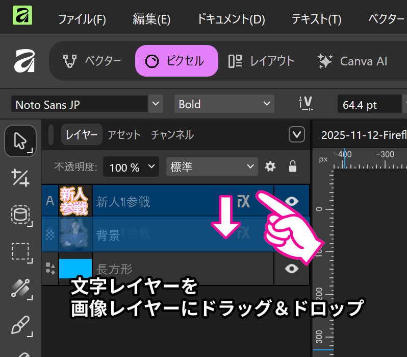 レイヤーパネルで文字レイヤーを画像レイヤーにドラッグ&ドロップします。