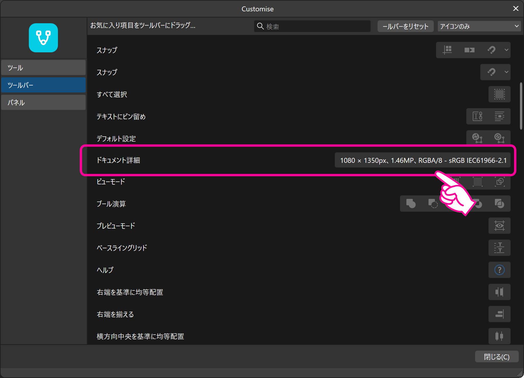 ちなみに、Affinityのスタジオ「ベクター」「ピクセル」「レイアウト」でツールバーの設定が独立しているので、それぞれのスタジオで今回のカラーモード・カラープロファイル表示の設定が必要です。