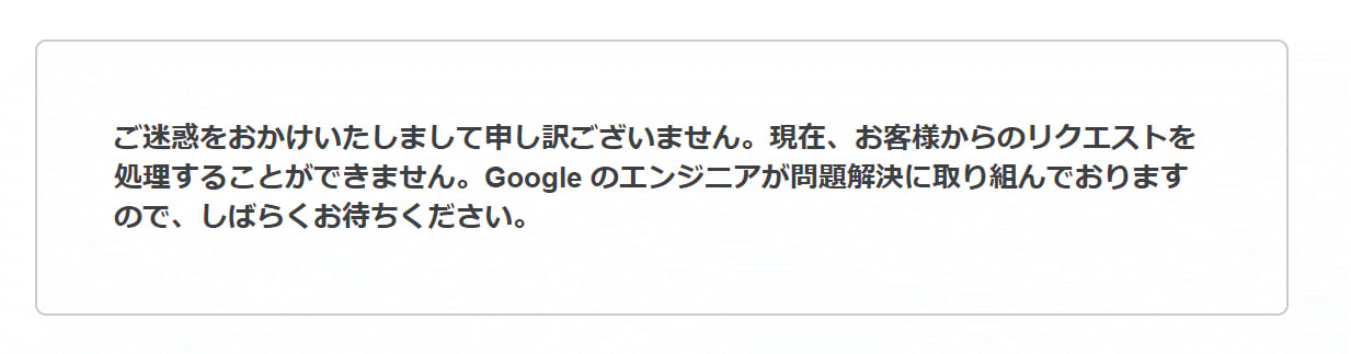 Google アドセンスの管理画面を開く際に「ご迷惑をおかけして申し訳ございません。現在、お客様からのリクエストを処理できません。Googleのエンジニアが問題解決に取り組んでおりますので、しばらくお待ちください。」と表示されて、アドセンスの管理画面のページを表示できないことがあります。