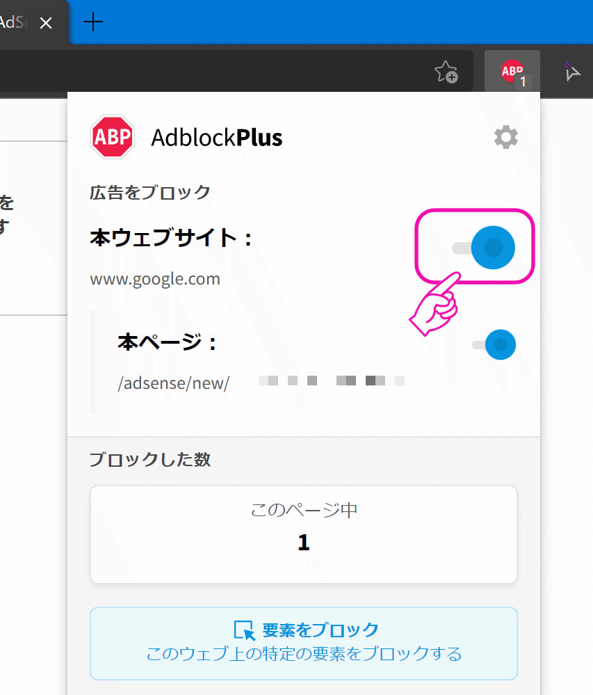 Google アドセンスの管理画面でツールバーにある「Adblock Plus」のアイコンをクリックします。
