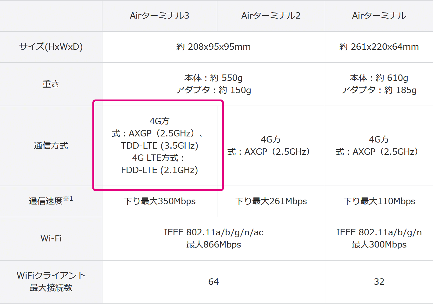 Airターミナル2はAXGP(2.5GHz)のみの対応ですが、Airターミナル3はAXGP(2.5GHz)とTDD-LTE(3.5GHz)とFDD-LTE(2.1GHz)の対応になっています。