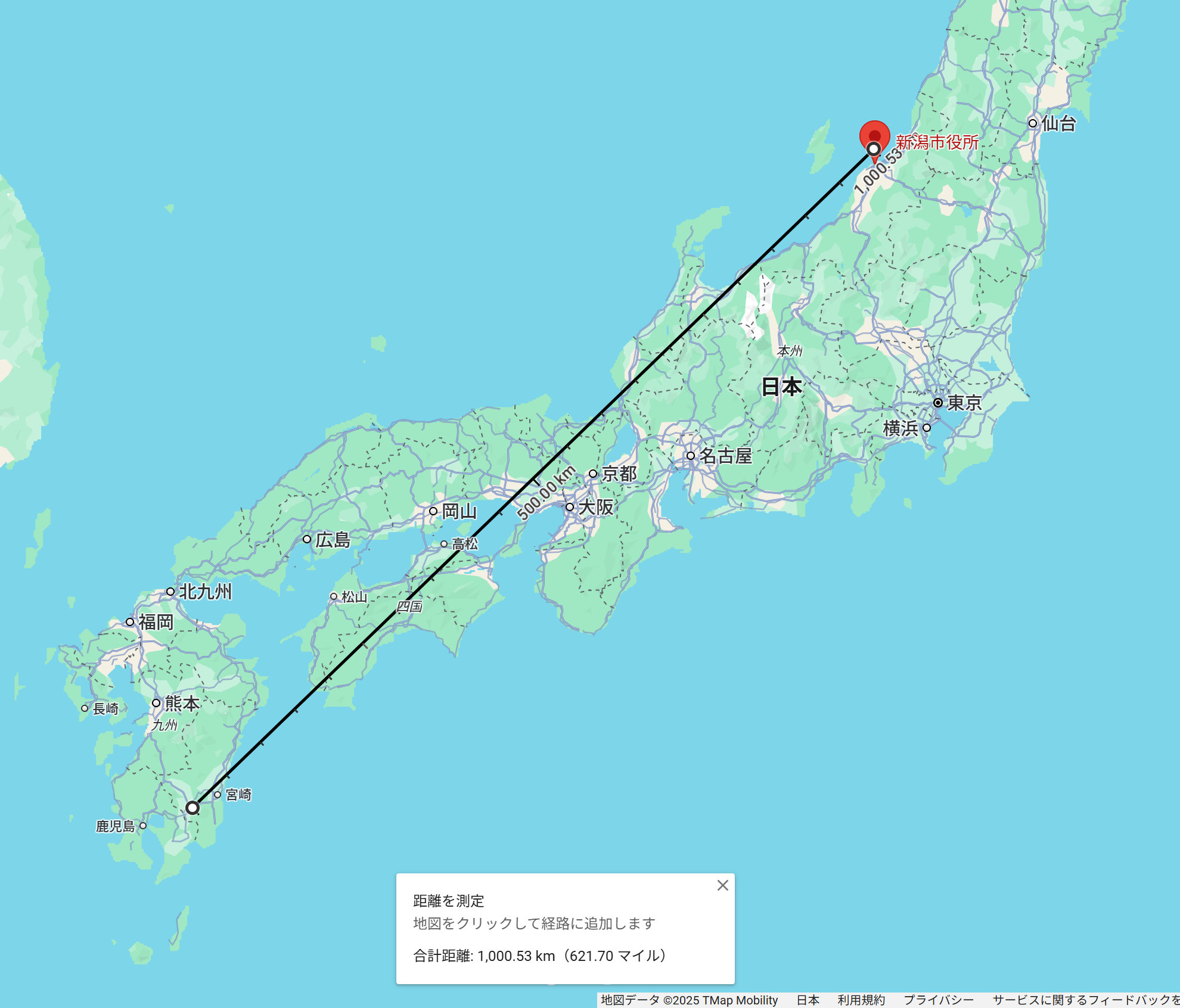 新潟市役所から1000kmの地点は宮崎県の都城市付近になります。遠すぎる!!
