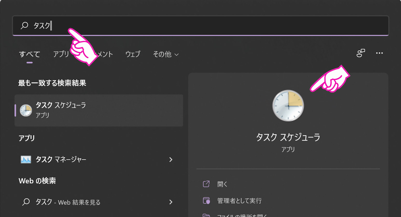 Windowsキーを押して(もしくはWindowsキー+SかQ)「タスク」と入力すると出てきますのでアイコンをクリックして起動します。※画面はWindows 11 21H2です。