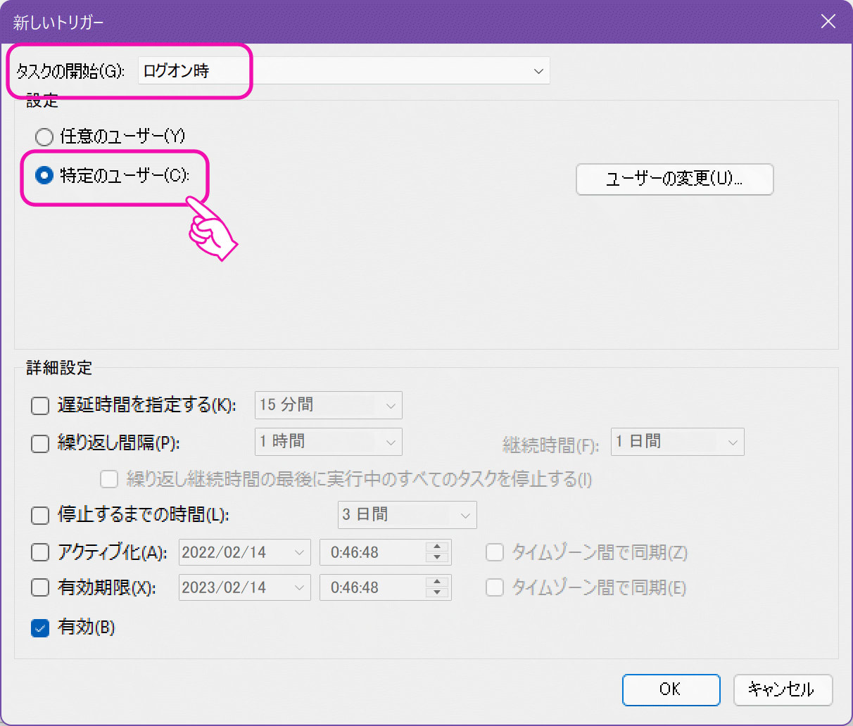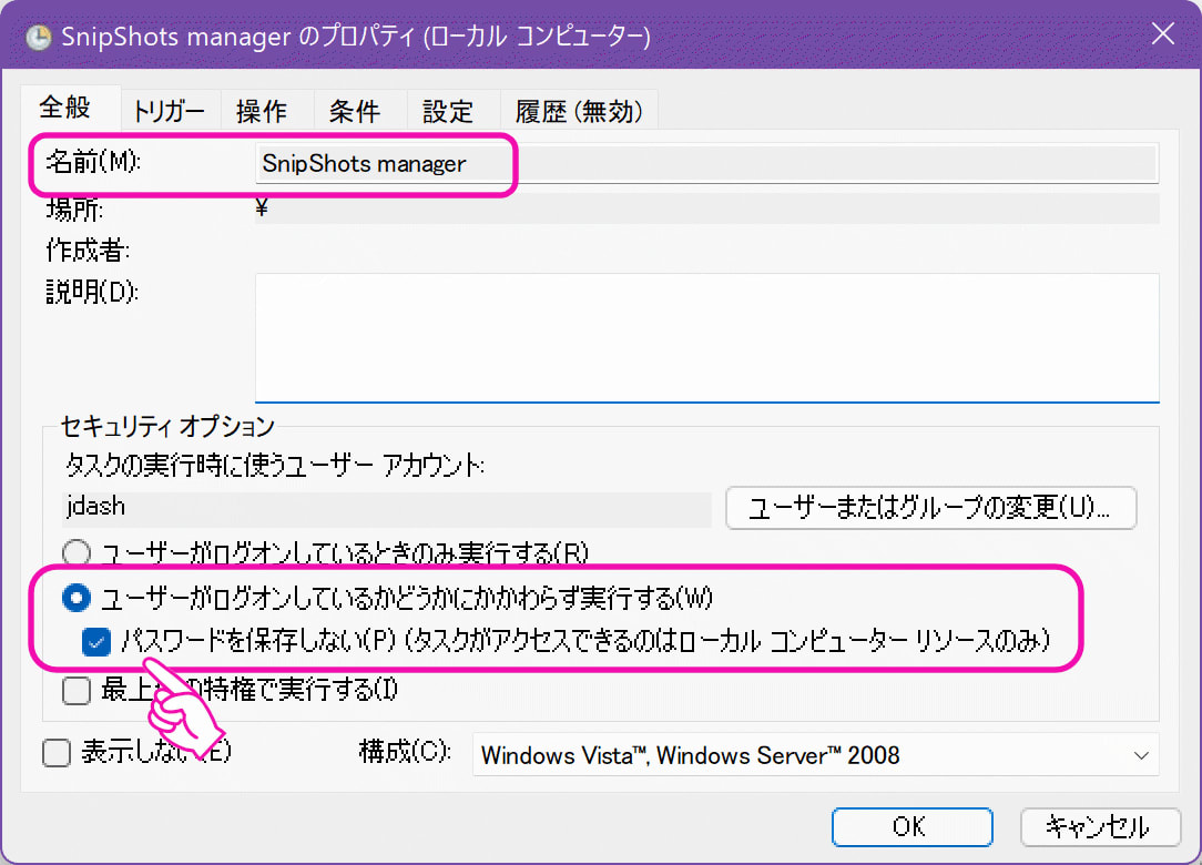 「ユーザーがログオンしているかどうかにかかわらず実行する」を選択します。