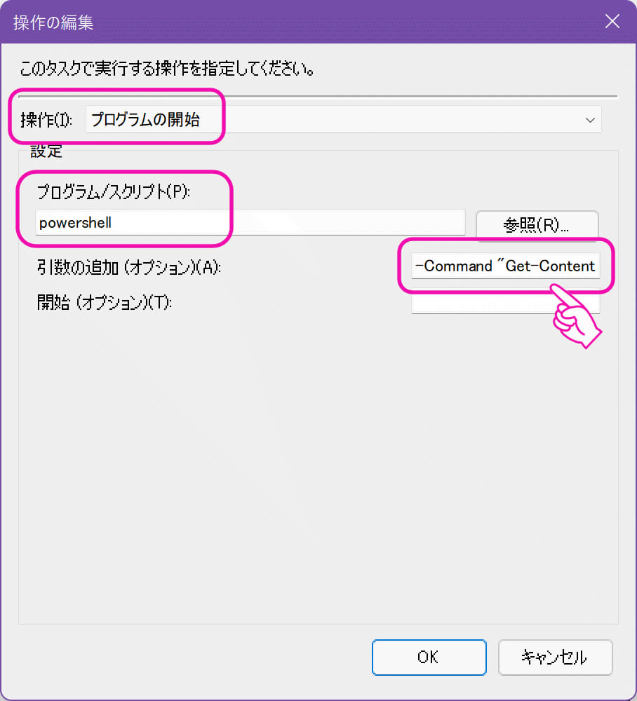 「引数の追加」は以下のようにします。「-Path」のあとのアドレスは先ほど作成したPowerShellのスクリプトの場所です。
