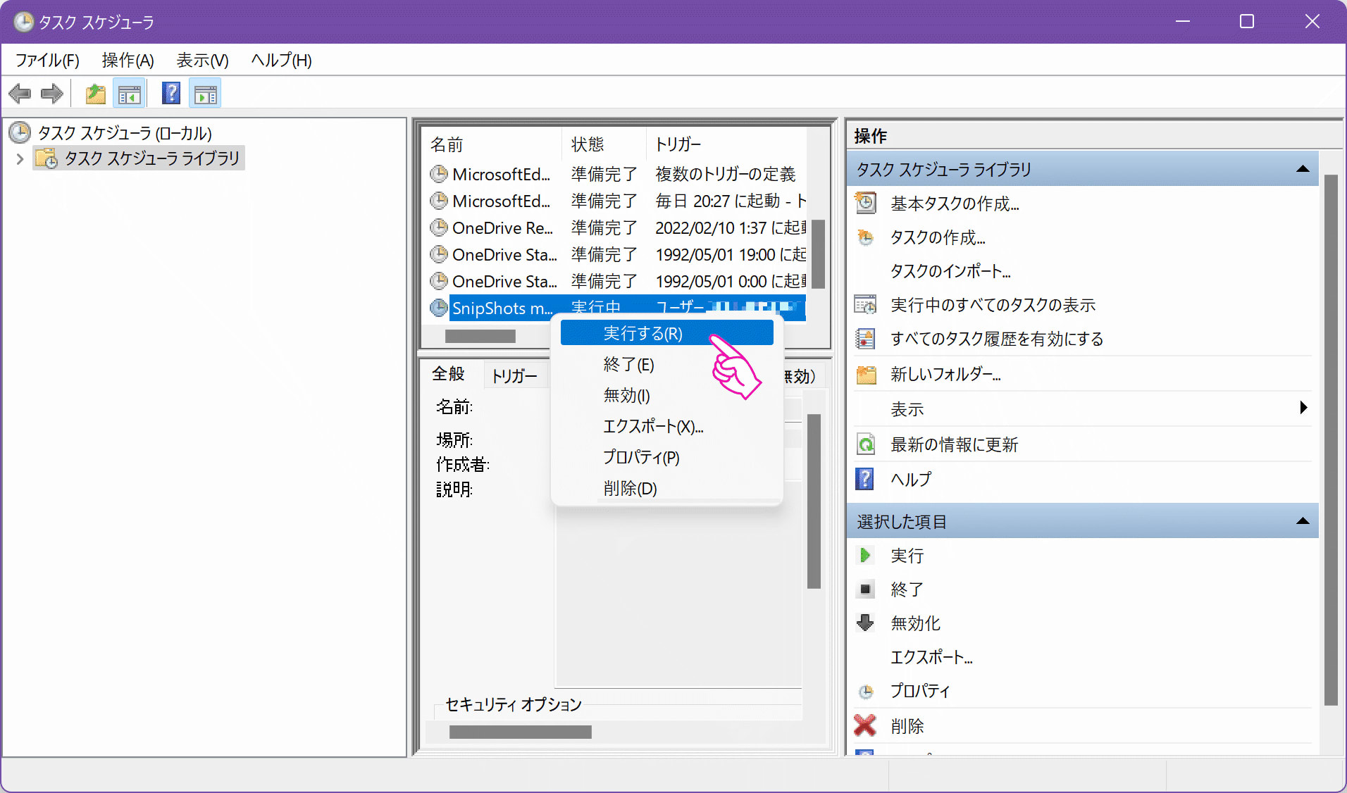 再ログオンが面倒な場合は、タスク スケジューラの真ん中に登録されているタスクが並んでいますので、今ほど作成したタスクを探して、右クリック→「実行する」を選択すると、すぐにPowerShellのスクリプトが有効になりますので試してみてください。