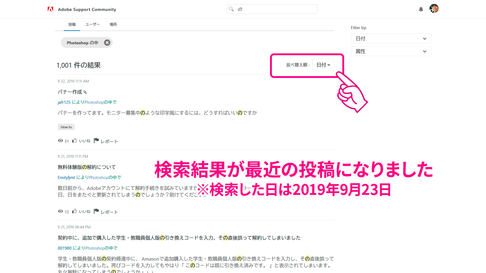 並び替えを「日付」にすることで、最近の投稿が出てきます。これで日本語の質問に回答ができますね!
