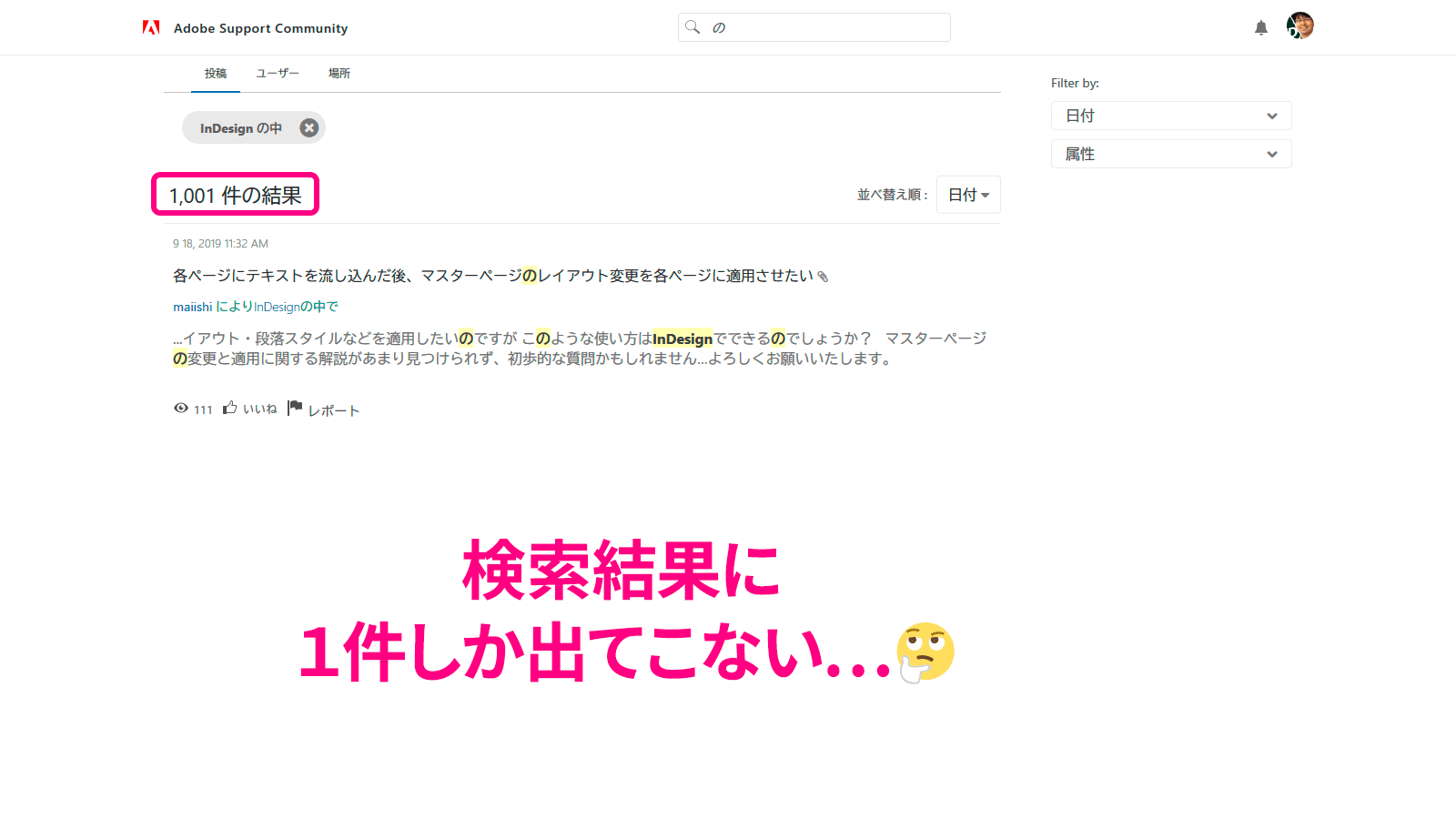 例えばInDesignのトピックを検索してみると、1件しか表示されません! どう考えてもシステムの不具合です?