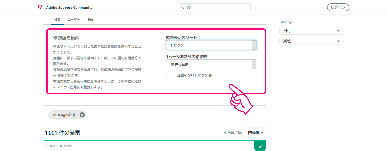 このページに書かれていたのは、Adobe Support Communityの検索の隠しコマンドについてでした。